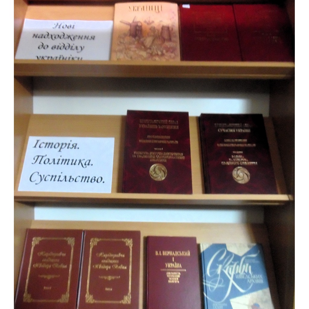 Відділ україніки презентує книги, передані Українським центром вивчення історії Голокосту, Національною асоціацією дослідників Голодомору, Французьким інститутом в Україні, подаровані Інститутом мистецтвознавства, фольклористики та етнології ім. М. Т. Рильського, а також отримані за обласною програмою. На виставці представлена література з української історії, етнографії, літературознавства, а також сучасна українська література, в тому числі дитяча.