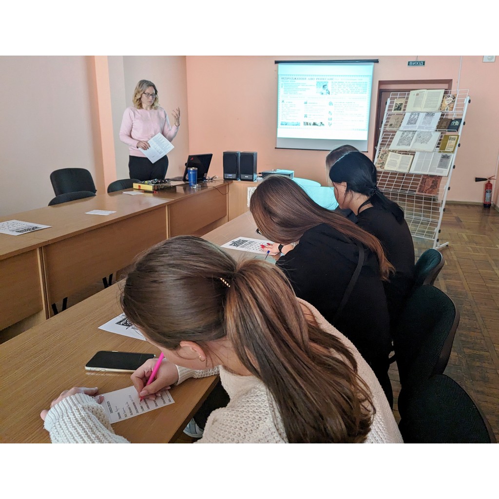 5 березня 2024 року в конференц-залі ЖОУНБ ім. О. Ольжича головний бібліотекар відділу гуманітарних видань Рудзінська Т. В. провела історичну годину «Витоки українського книгодрукування» для студентів I курсу ТО-13/ІТ-1 ЖТЕФК ДТЕУ(класний керівник – Черниш Аліна Василівна). Студенти переглянули документально-історичні матеріали, дискутували та брали активну участь в обговоренні новітніх досягнень епохи Відродження, а також згадали про яскравих представників цього історичного періоду – вчених, митців, винахідників. Молодь познайомилась з досягненнями у друкарській справі Йоганна Гутенберга, які стали передумовами для активного розвитку книжної справи по всій Європі. Під час зустрічі студенти дізнались, що найдавнішими з точно датованих українських стародруків були “Апостол”, “Буквар”, випущені в 1574 році у Львівській друкарні Іваном Федоровим та надруковані кириличним шрифтом. Всі охочі створювали власні листівки та закладки для книг, використовуючи техніку штампування та підручні матеріали.
