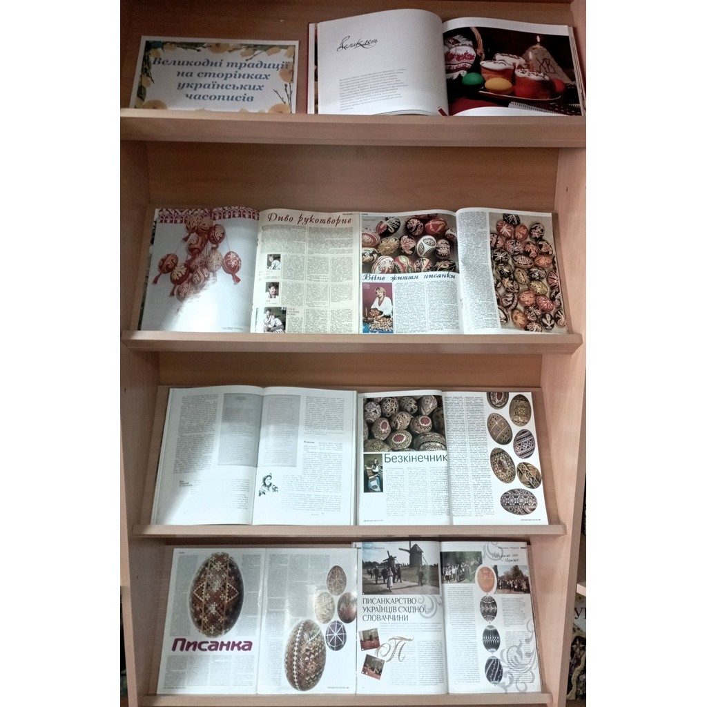 На виставці представлені статті з журналів «Українська культура», «Українська родина», «Народне мистецтво», «Світогляд» та ін., у яких розглянуто давні традиції святкування Великодня. Значна частина матеріалів стосується писанкарства. Великоднє яйце, як символ вічного життя, є зразком оригінального народного розпису, мініатюри, унизаної яскравими й таємничими орнаментами. До уваги відвідувачів бібліотеки представлені зразки писанкарства різних регіонів України, що зберегли багато старовинних орнаментальних мотивів та витончений малюнок, а також писанки українців діаспори.