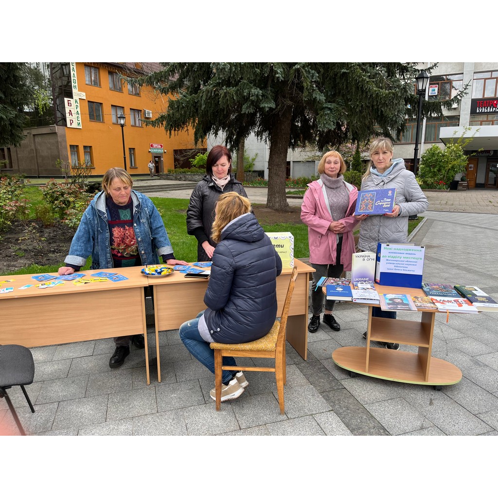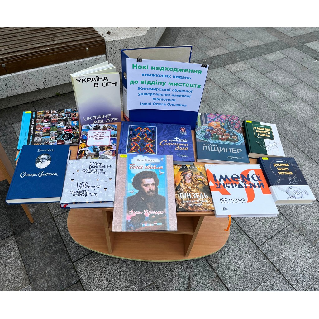 З 14.00 до 15.00 провідний бібліотекар відділу мистецтв Птіцина О. А. у рамках Дня відкритих дверей з нагоди заснування КЗ «ОУНБ ім. О. Ольжича» ЖОР брала участь у вуличній акції з презентацією літератури «Нові надходження книжкових видань до відділу мистецтв бібліотеки». Вона презентувала 12 книг які надійшли у 2024 році у фонд відділу: Україна в огні, Духовна велич України, В акордах вічності і слави автора Романа Берези, Імена України: 100 митців ХХ століття, Марія Примаченко Строката доля, Віталій Ханко Опанас Сластьон, Ірина Пустиннікова Пінзель: фантазія на тему біографії, Михайло Ліщинер Живопис, Неллі Топська Геній світла: Архип Куїнджі, Мирослава Макаревич Хто тримає культурний фронт України, Поліфонія діалогу в постсучасній культурі:збірник наукових праць, Василь Кричевський Орнаментні композиції.