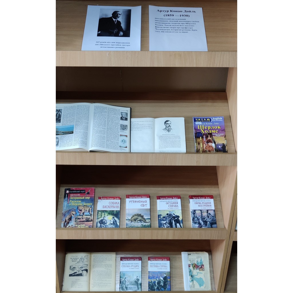 - «Літературний світ детективу Артура Конан Дойля»(1859-1930): До 165-ї річниці від дня народження англійського прозаїка, видатного автора детективних творів. Артур Конан Дойль, творець знаменитого Шерлока Холмса, залишив неповторний слід у жанрі детективу. Його твори продовжують захоплювати читачів своєю інтригою та майстерністю;