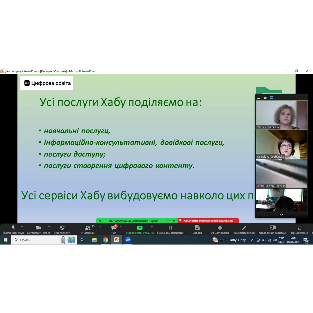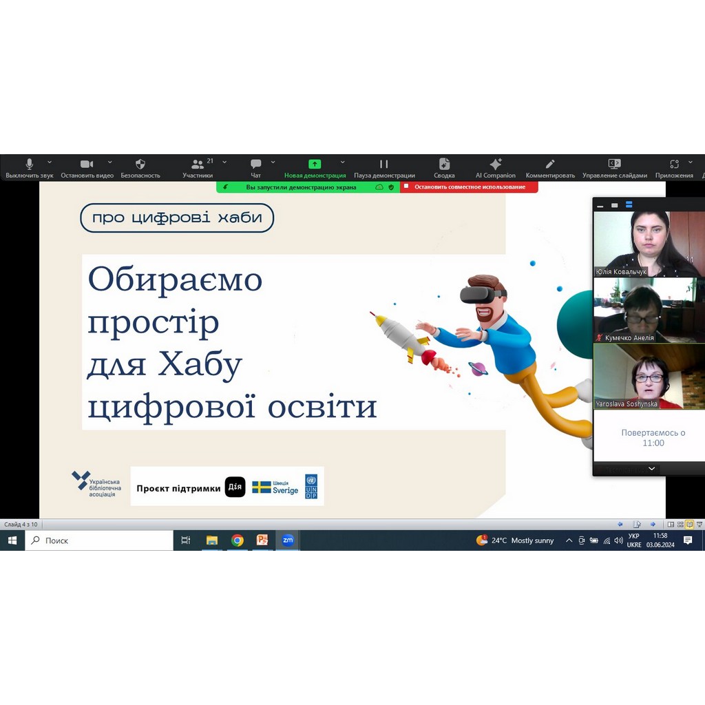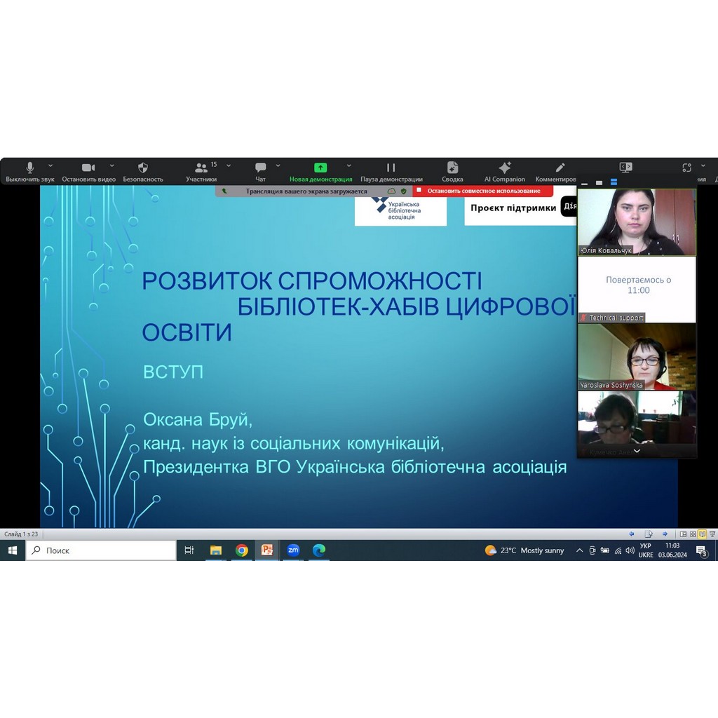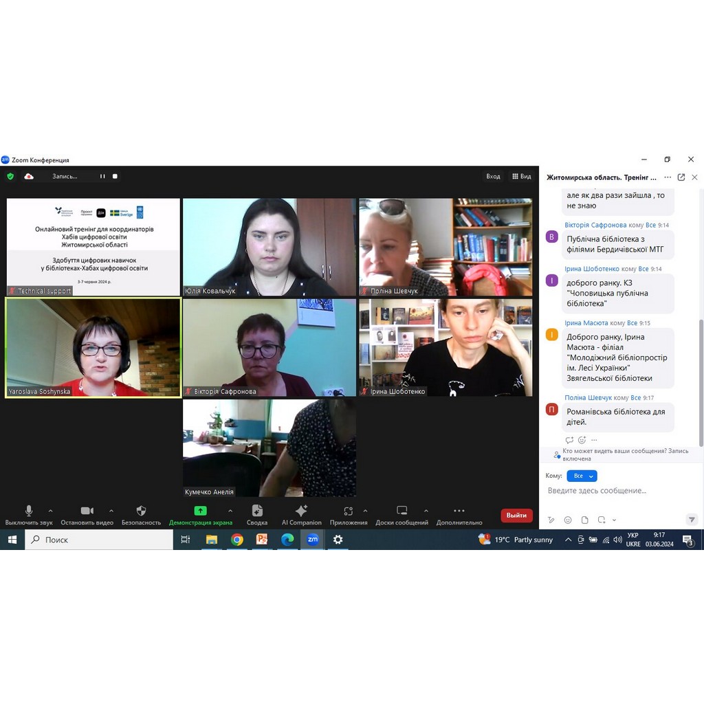 03-07 червня 2024 року тренерки Хабу цифрової освіти ЖОУНБ ім. О. Ольжича, Ковальчук Ю. В., Стрелківська Р. Р. та Чорноморець Л. В., за сприяння Ярослави Сошинської, експертки-консультантки ВГО «УБА» провели 5-ти денний навчальний тренінг для 1 групи координаторів Хабів цифрової освіти Житомирської обл., у межах проєкту ВГО «Української бібліотечної асоціації» - «Здобуття цифрових навичок у бібліотеках - Хабах цифрової освіти».