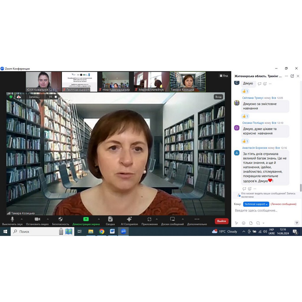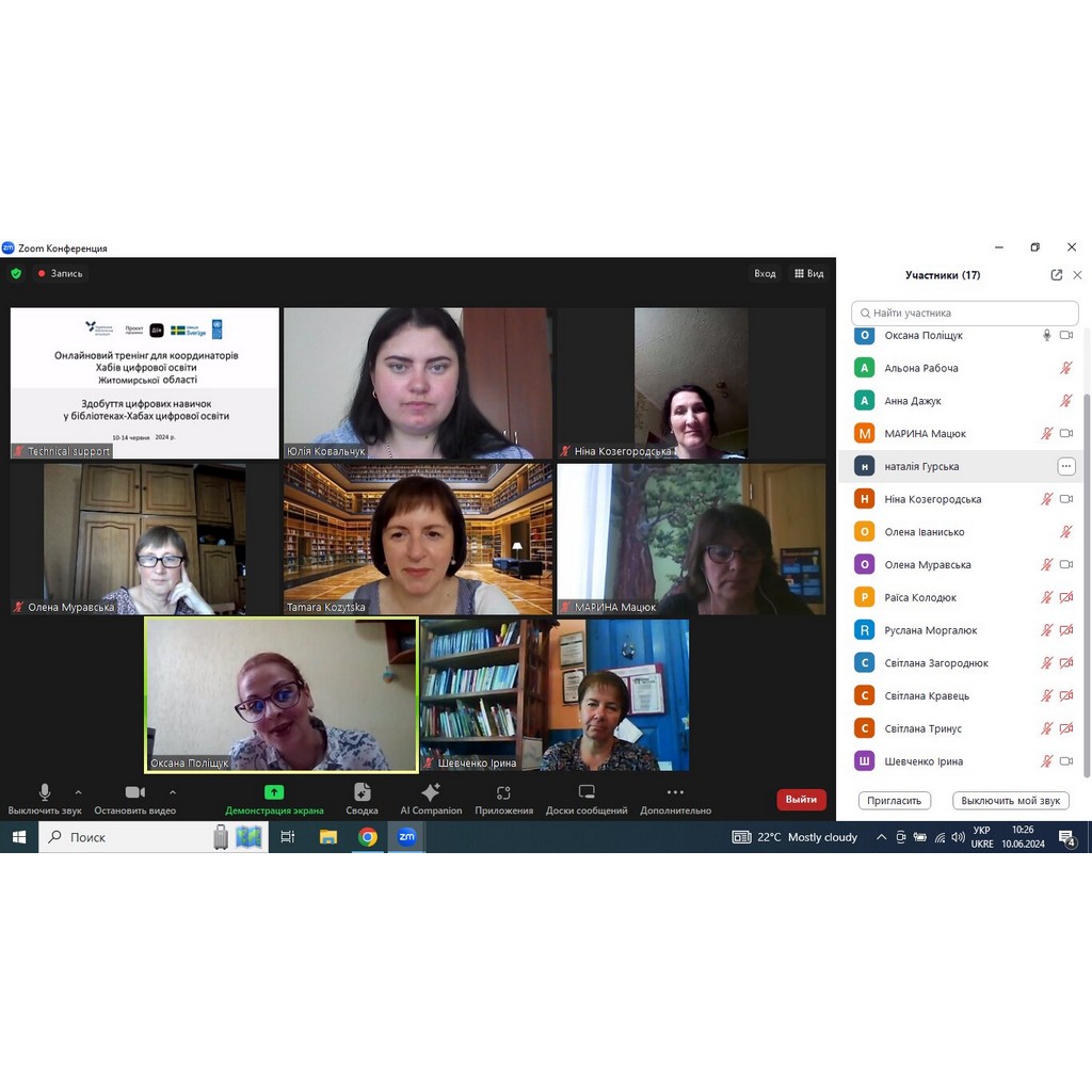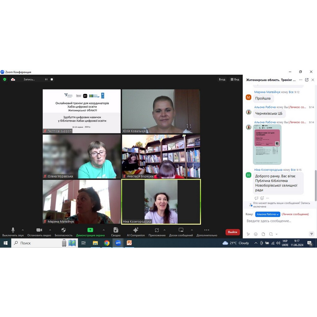 10-14 червня 2024 року тренерки Хабу цифрової освіти ЖОУНБ ім. О. Ольжича, Ковальчук Ю. В., Стрелківська Р. Р. та Чорноморець Л. В., за сприяння Тамари Козицької, експертки-консультантки ВГО «УБА», провели 5-ти денний навчальний тренінг для 2 групи координаторів Хабів цифрової освіти Житомирської обл., у межах проєкту ВГО «Української бібліотечної асоціації» - «Здобуття цифрових навичок у бібліотеках-Хабах цифрової освіти».
