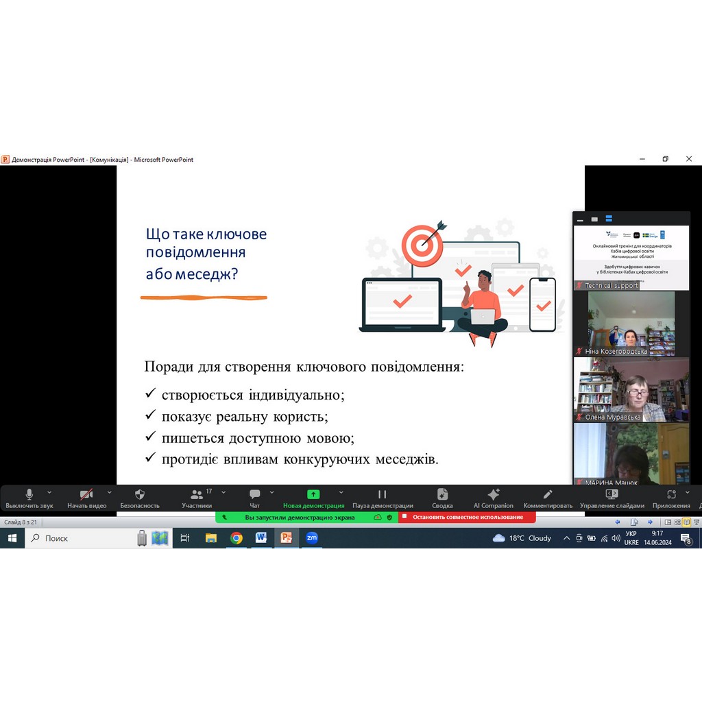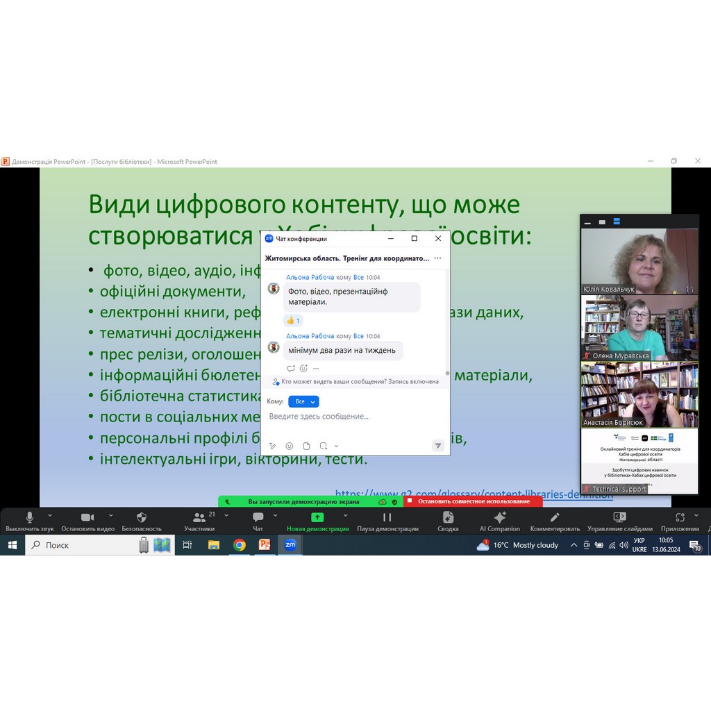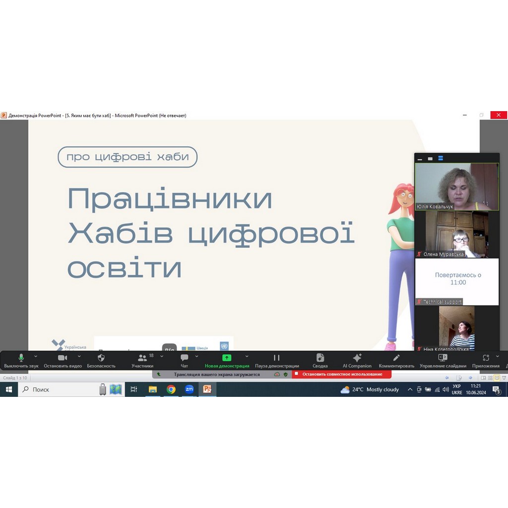 10-14 червня 2024 року тренерки Хабу цифрової освіти ЖОУНБ ім. О. Ольжича, Ковальчук Ю. В., Стрелківська Р. Р. та Чорноморець Л. В., за сприяння Тамари Козицької, експертки-консультантки ВГО «УБА», провели 5-ти денний навчальний тренінг для 2 групи координаторів Хабів цифрової освіти Житомирської обл., у межах проєкту ВГО «Української бібліотечної асоціації» - «Здобуття цифрових навичок у бібліотеках-Хабах цифрової освіти».