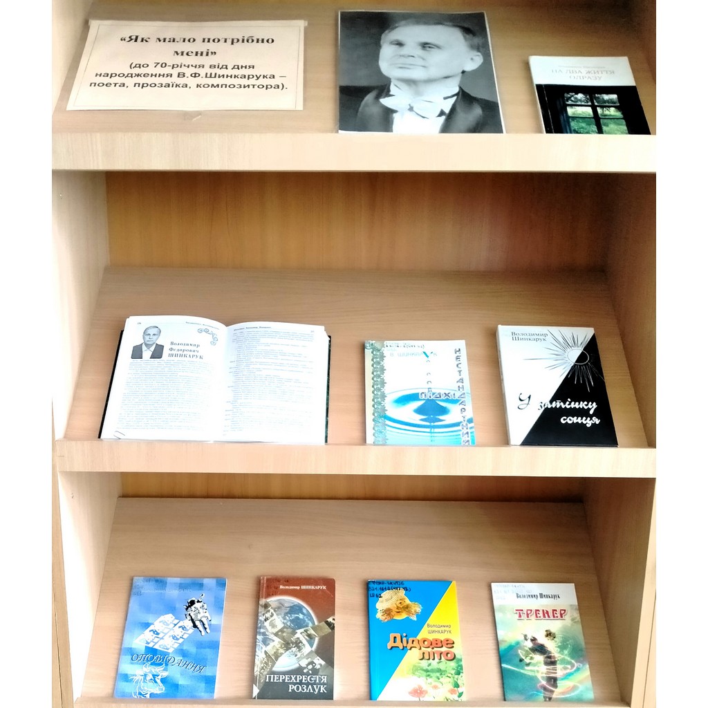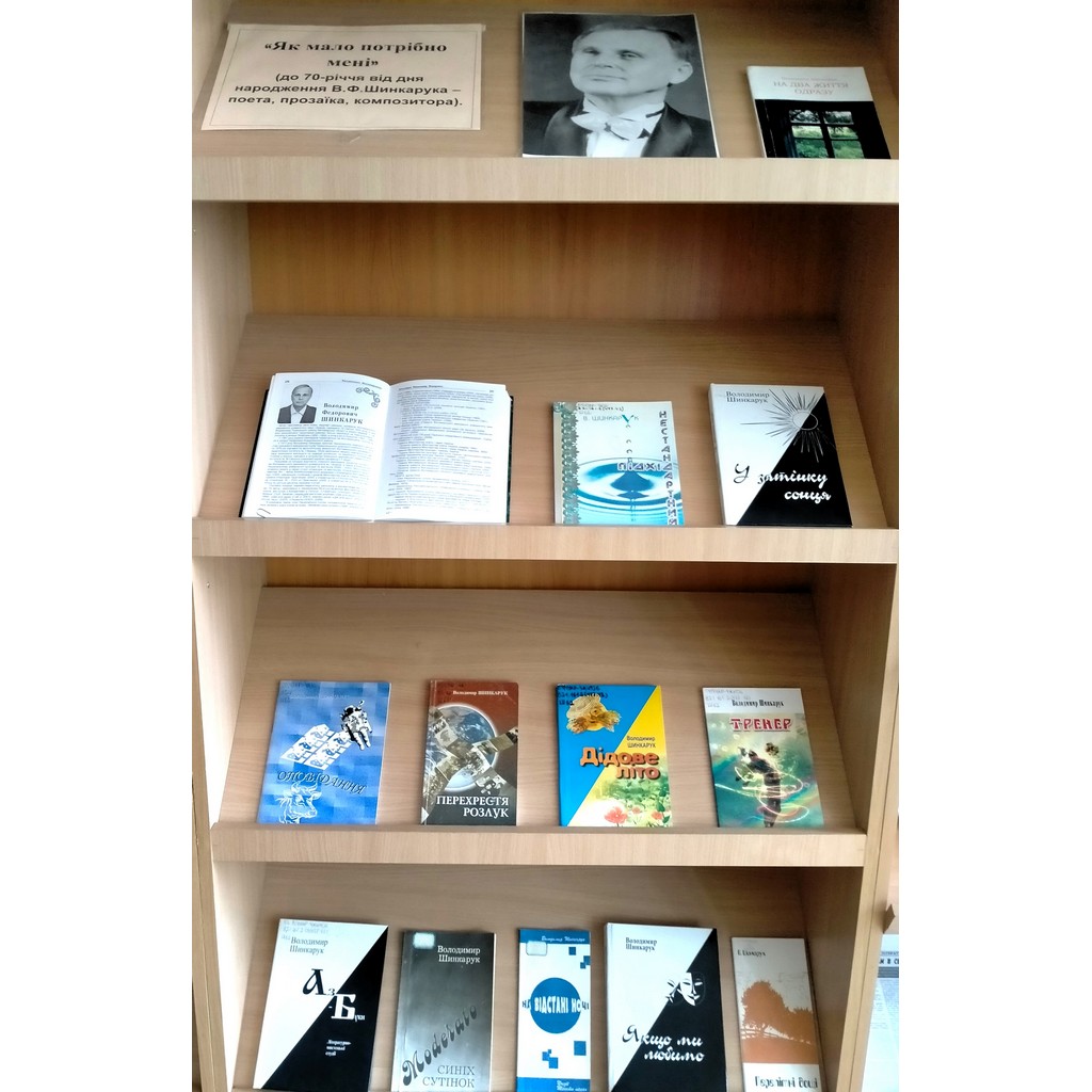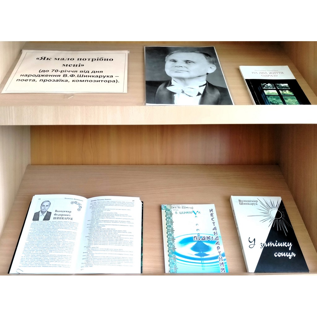 18 серпня 2024 року у відділі краєзнавства ЖОУНБ ім. О.Ольжича представлено книжкову виставку із циклу «Ім’я в історії краю»: «Як мало потрібно мені» (до 70-річчя від дня народження В. Ф. Шинкарука – поета, прозаїка, композитора).