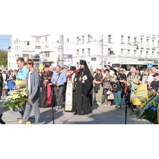 Присутні вшанували пам’ять загиблих за незалежність нашої держави хвилиною мовчання. Над площею підняли великий Державний прапор України, а в небо злетіли блакитні та жовті повітряні кульки.