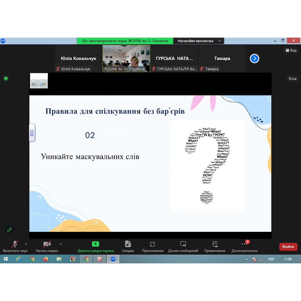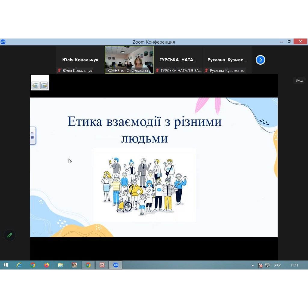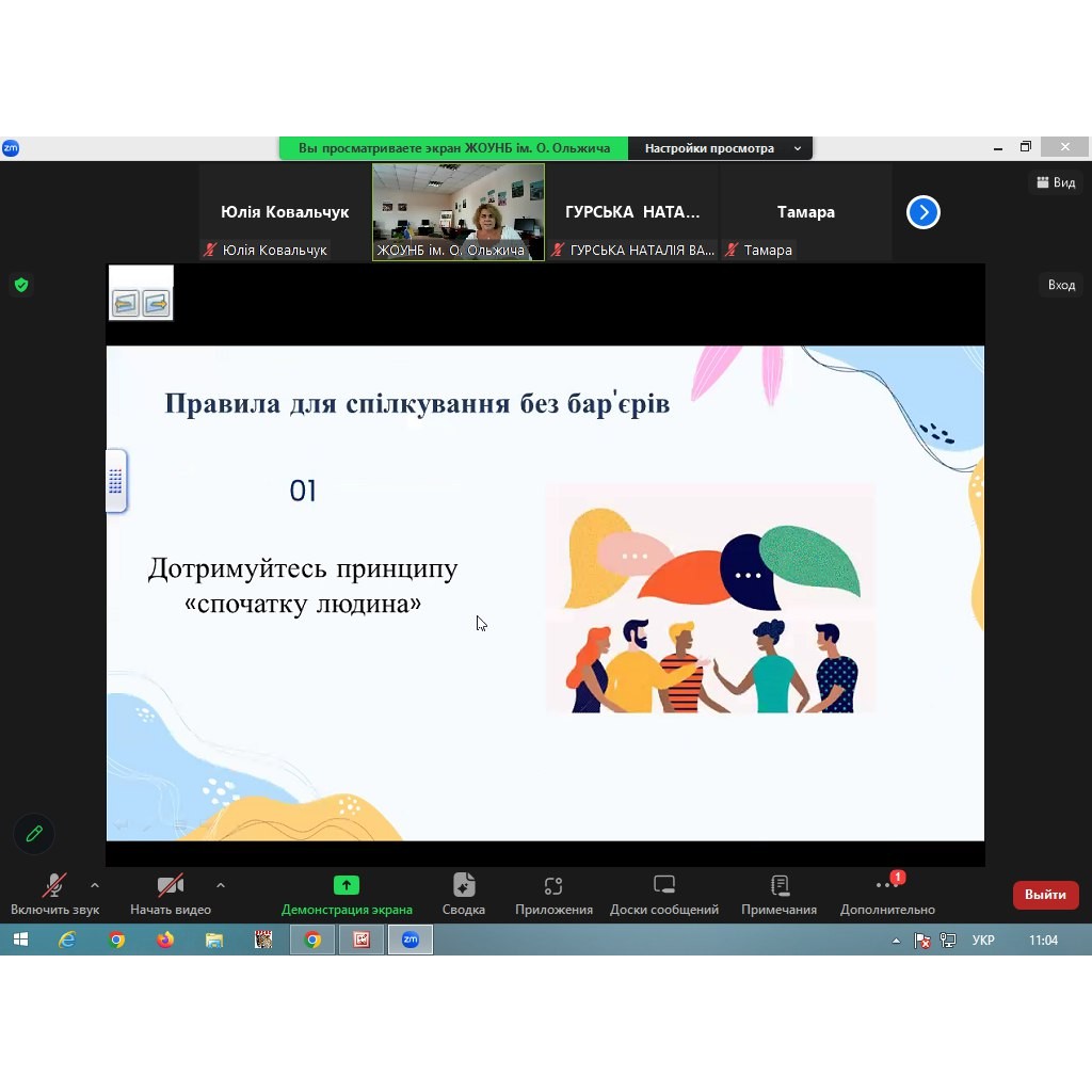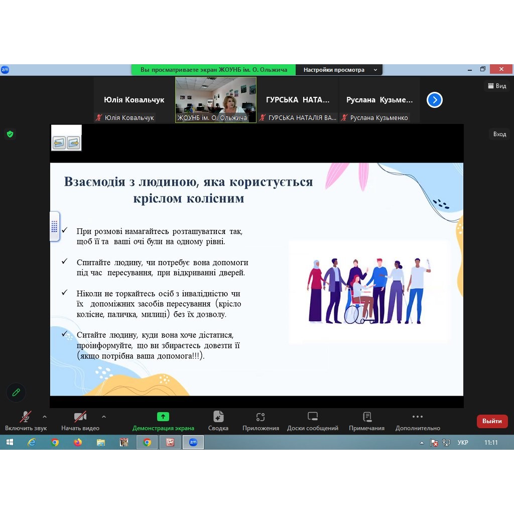 25 липня 2024 року завідувачка відділу «Інклюзивний читальний зал» ЖОУНБ ім. О. Ольжича провела вебінар «Безбар’єрна бібліотека. Правила безбар’єрного спілкування» на виконання Обласного плану заходів на 2024 рік з реалізації Національної стратегії зі створення безбар’єрного простору в Україні на період до 2030 року для бібліотечних працівників області.