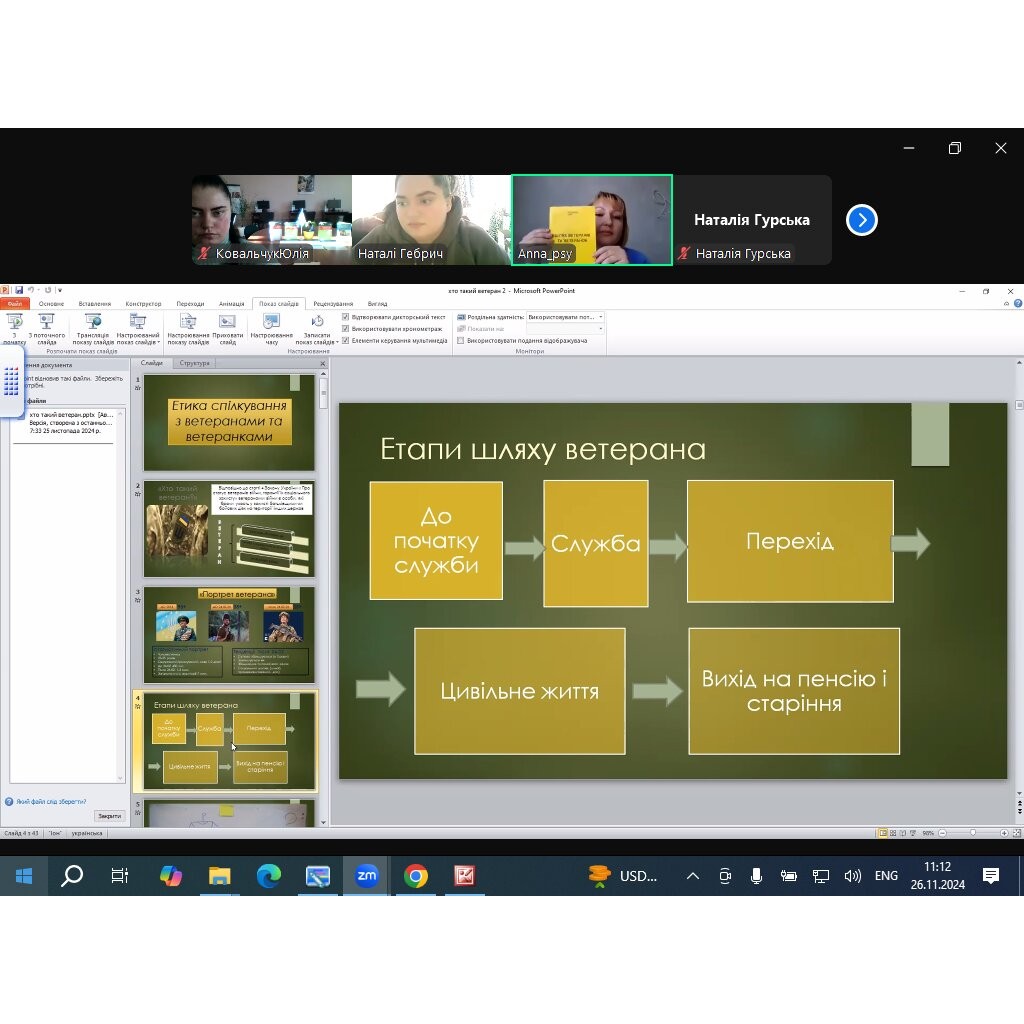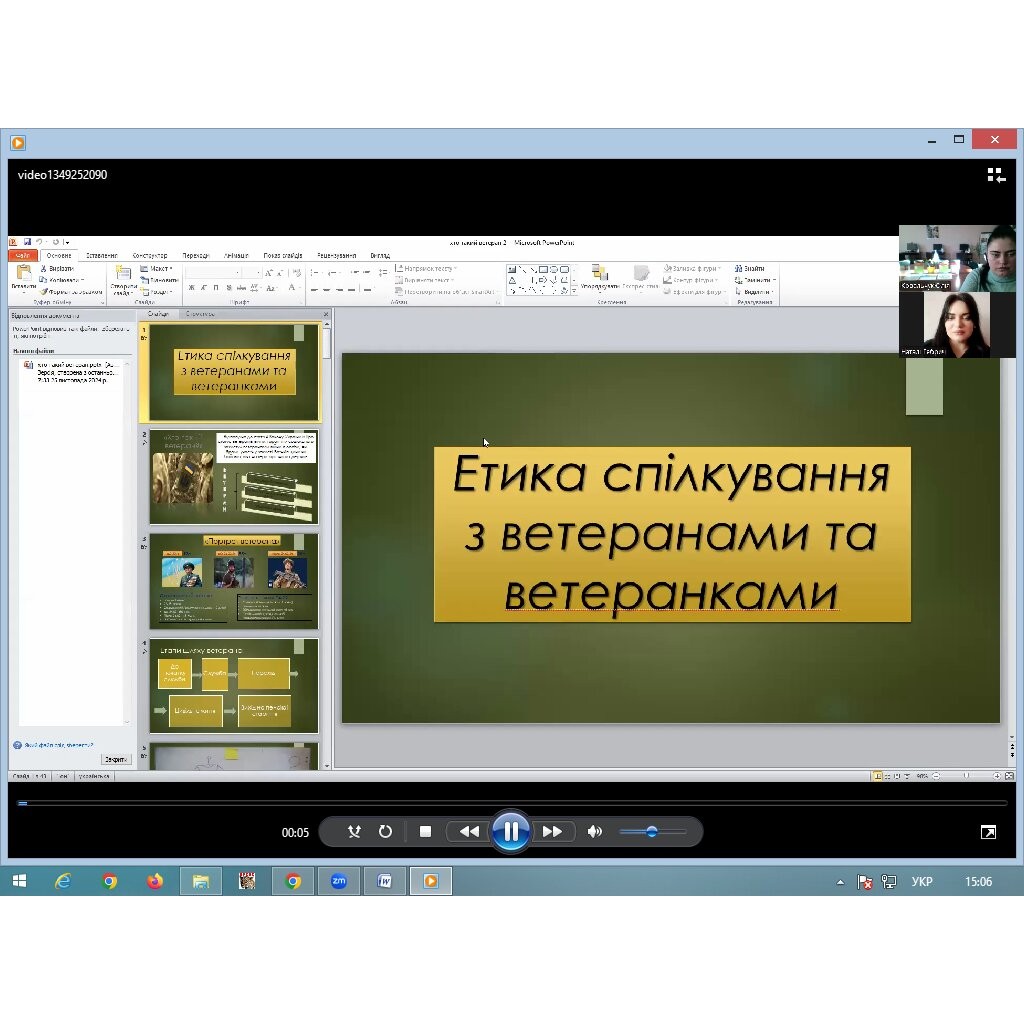 Під час вебінару учасники мали можливість поглибити свої знання про основні принципи спілкування з ветеранами, важливість чутливого підходу до своїх переживань та викликів, з якими вони стикаються після повернення до мирного життя. Бібліотекарі ознайомилися з іншими аспектами, такими як поняття «ветеран», етичні правила спілкування, які дозволяють уникнути незручних тем або тем, які травмують. Також були спростовані міфи про ветеранів, підкреслювалася важливість культури вдячності, яка сприяє налагодженню ефективної комунікації та підтримки.