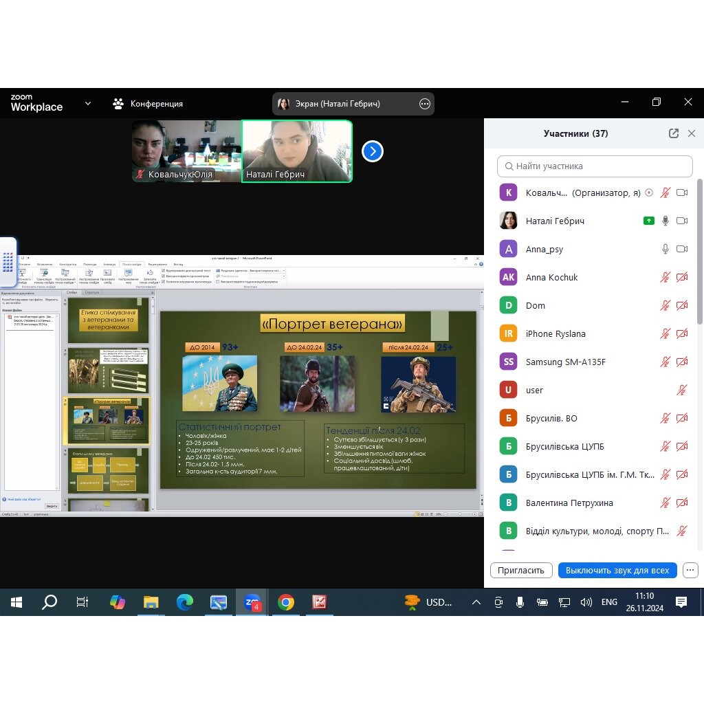 26 листопада 2024 року в секторі «Інтернет-центр» ЖОУНБ ім. О. Ольжича для бібліотечних працівників Житомирської області відбувся вебінар, який провели психологи - Анна Галенко та Наталія Гебрич з Центру допомоги ветеранам та членам їх родин http://surl.li/ckctkq на тему «Етика спілкування з ветеранами та ветеранками» в рамках проведення заходів щодо реалізації Національної стратегії зі створення безбар’єрного простору в Україні.