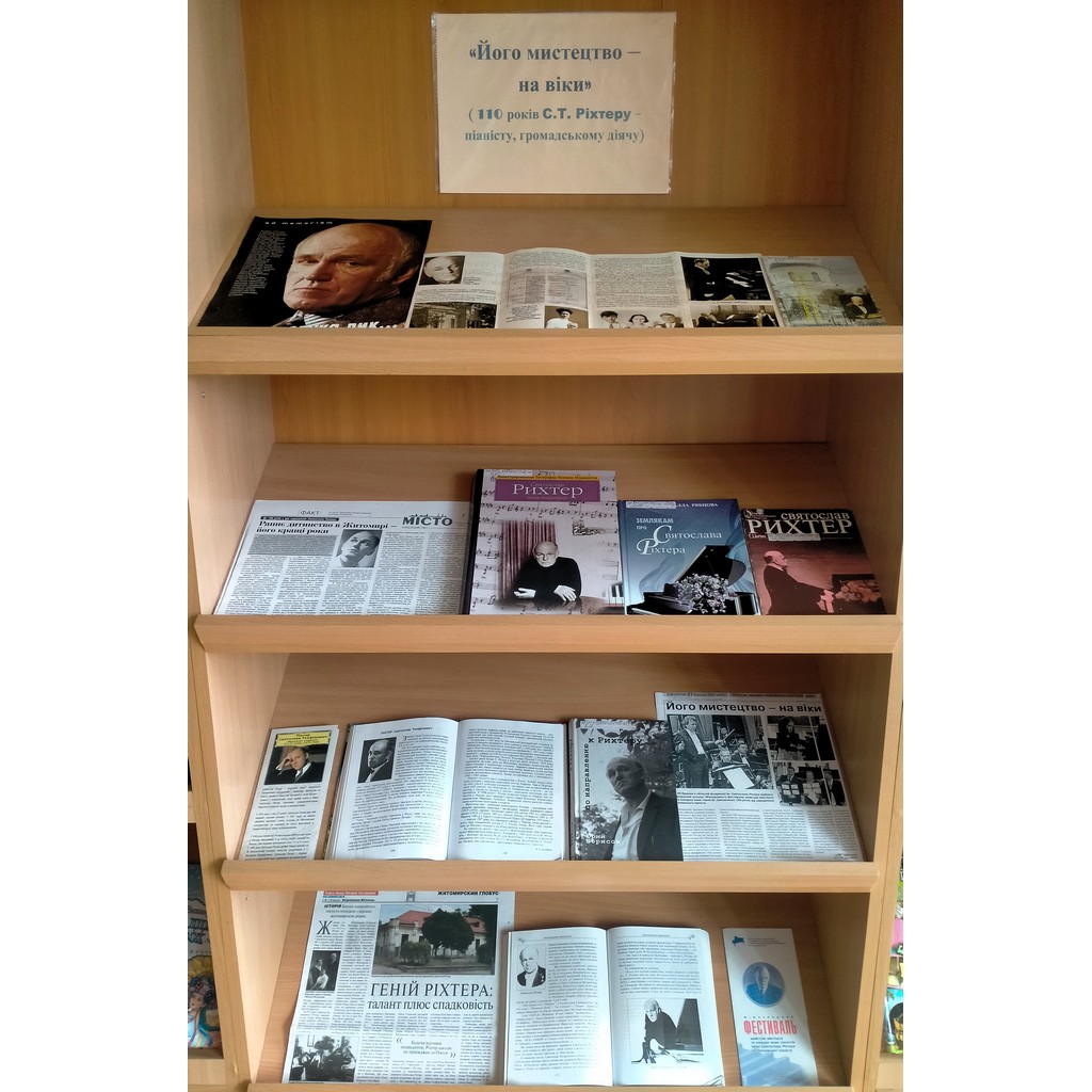 Протягом березня 2025 року у краєзнавчому відділі бібліотеки представлено  книжкову виставку з циклу «Ім’я в історії краю»: «Його мистецтво – на віки» ( 110 років С.Т. Ріхтеру – піаністу, громадському діячу).