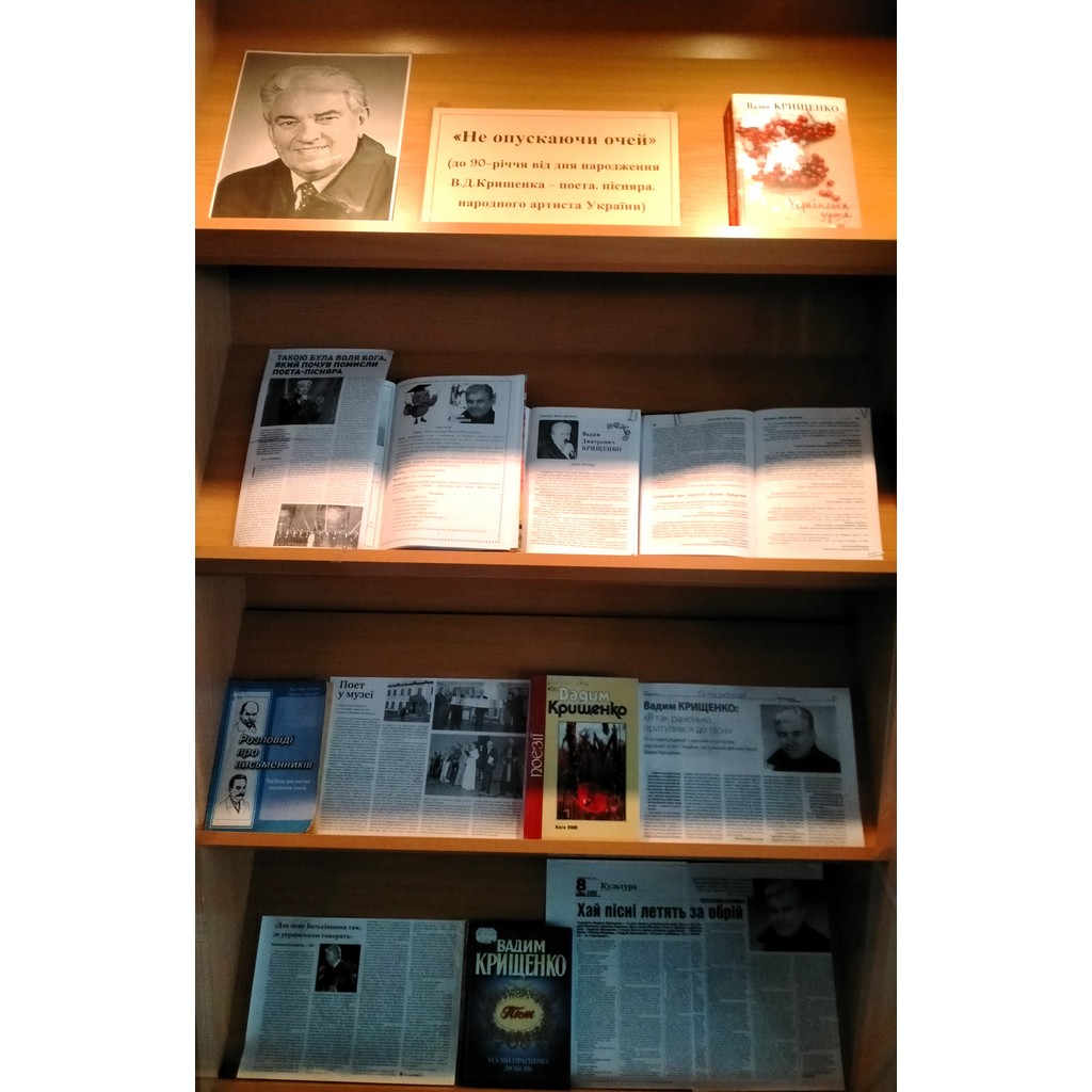 Протягом квітня 2025 року в холі ЖОУНБ ім. О. Ольжича експонується книжкова виставка із циклу: «Культурно-освітня спадщина Житомирщини»: «Не опускаючи очей» (до 90-річчя від дня народження В.Д.Крищенка - поета, пісняра, народного артиста України).