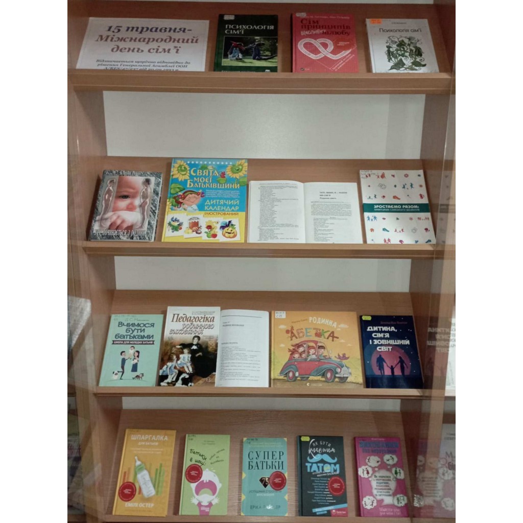 У травні все прогресивне людство відзначає Міжнародний день сім’ї. Це свято запроваджене в 1993 році Генеральною Асамблеєю ООН з метою об’єднання можливостей різних країн для вирішення всіх найсерйозніших питань, пов’язаних із сім’єю. З нагоди цього свята оформлено книжкову виставку відповідного тематичного спрямування, знайомлячись з якою користувач може знайти для себе багато цікавого з психології людських відносин та взаємовідносин в сім’ї, поради з питань виховання дітей, видання педагогічного спрямування, а також книги про права, звичаї, традиції, обереги української родини.