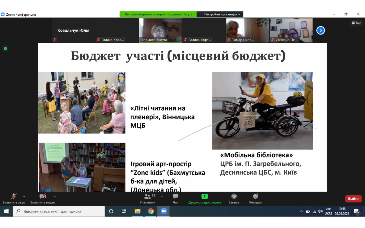 ім. Я. Мудрого, ЖОУНБ ім. О. Ольжича, Житомирської обласної бібліотеки для юнацтва, обговорювались важливі питання бібліотечної практики: «Правові аспекти організації та діяльності публічних бібліотек в умовах трансформаційних змін» (Л. В. Лагута, головний бібліотекар НМВ НБУ