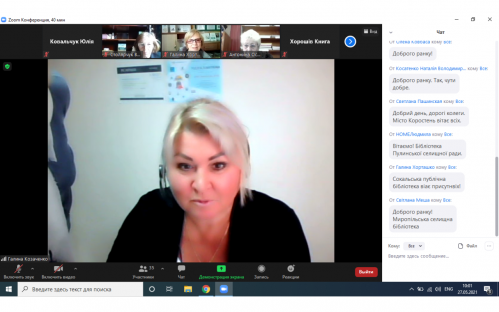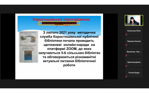 ім. Я. Мудрого), «Діяльність бібліотек територіальних громад з формування, обліку та збереження книжкових фондів в сучасних умовах» (В. В. Зубенко, завідуюча відділом формування фондів ЖОУНБ ім. О. Ольжича), «Користування сервісом ECMaP» (Г. Г. Козаченко, головний методист НМВ ЖОУНБ ім. О. Ольжича), «Діяльність методичних служб публічних бібліотек Житомирщини під час карантинних обмежень» (О. О. Ковальчук, провідний методист НМВ ЖОУНБ ім. О. Ольжича), «Хмарні сховища та зберігання інформації» (Ю. В. Іваникіна, завідуюча сектором «Інтернет-центр» ЖОУНБ