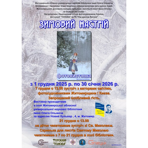 З 1 грудня 2025 року по 30 січня 2026 року в холі бібліотеки експонується фотовиставка «Зимовий настрій» фотоклуба «Толока».