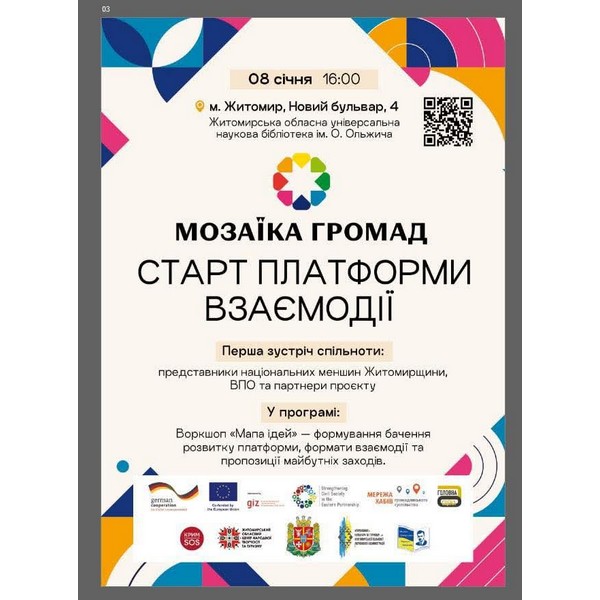 Шановні користувачі, з 24 грудня 2025 року по 30 січня 2026 року функціонує Коворкінг-платформа міжкультурної взаємодії "Мозаїка громад".