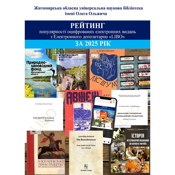Шановні користувачі, пропонуємо Вашій увазі ТОП-10 найбільш популярних видань у 2025 році за рейтингом перегляду з електронного ресурсу оцифрованих документів ОУНБ ім. О. Ольжича Житомирської обласної ради.