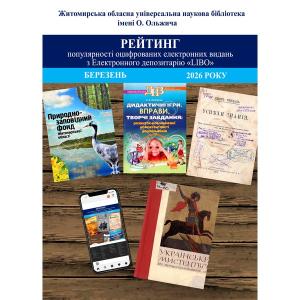 Пропонуємо Вашій увазі ТОП-5 найбільш популярних видань за рейтингом перегляду з електронного ресурсу оцифрованих документів ОУНБ ім. О. Ольжича Житомирської обласної ради у березні 2026 року.