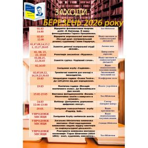 Шановні користувачі, щодня в нашій бібліотеці відбувається безліч цікавих заходів та подій, ознайомтесь будь-ласка з календарем заходів на березень 2026 року, та приходьте до нас.