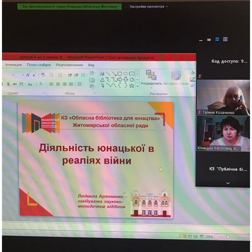 слухачі заходу також детально ознайомилися з досвідом обласної юнацької бібліотеки за темою : «Діяльність юнацької в реаліях війни» (Людмила Артеменко, завідуюча НМВ Житомирської обласної бібліотеки для юнацтва).