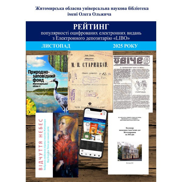 Пропонуємо Вашій увазі ТОП-5 найбільш популярних видань у листопаді 2025 року за рейтингом перегляду з електронного ресурсу оцифрованих документів ОУНБ ім. О. Ольжича Житомирської обласної ради.