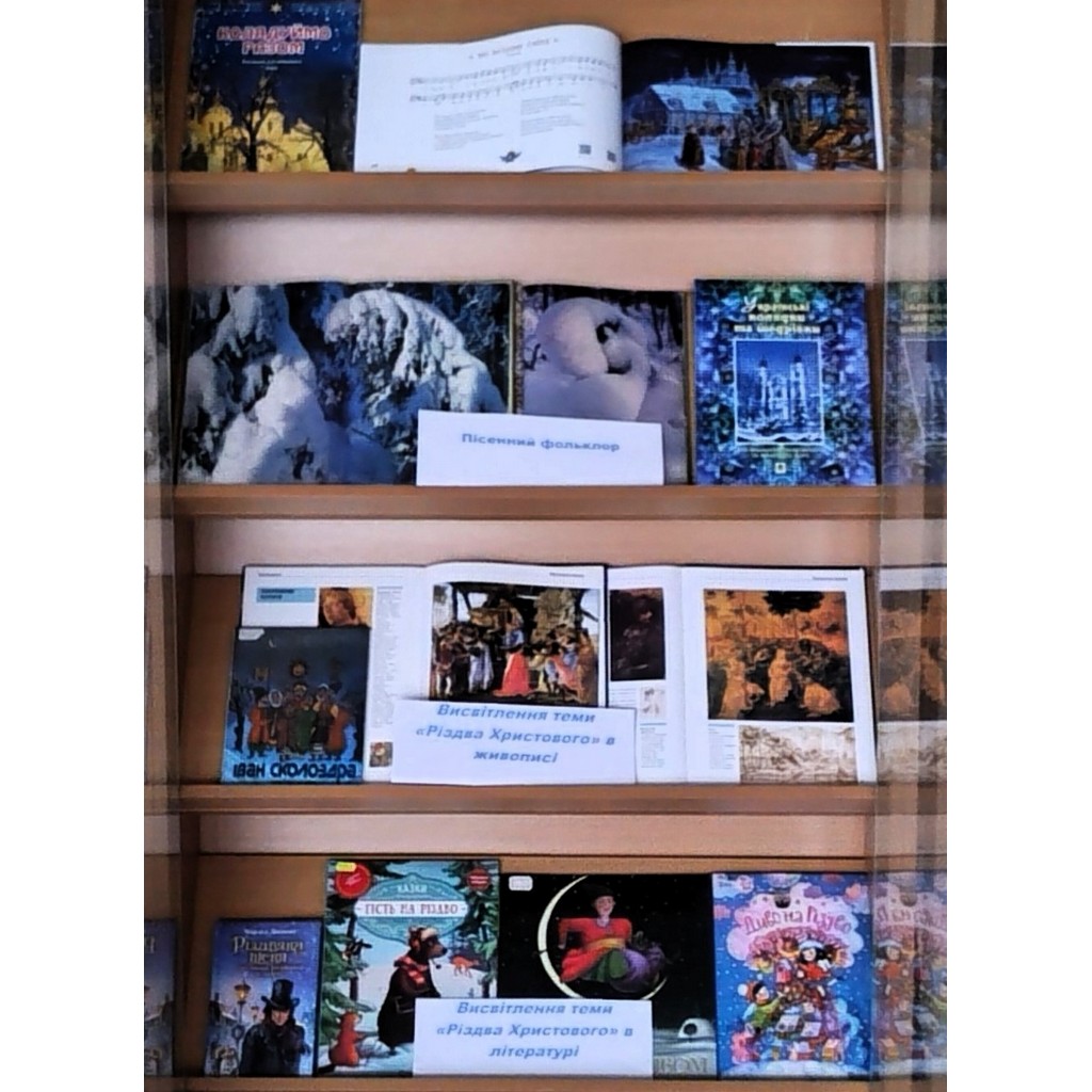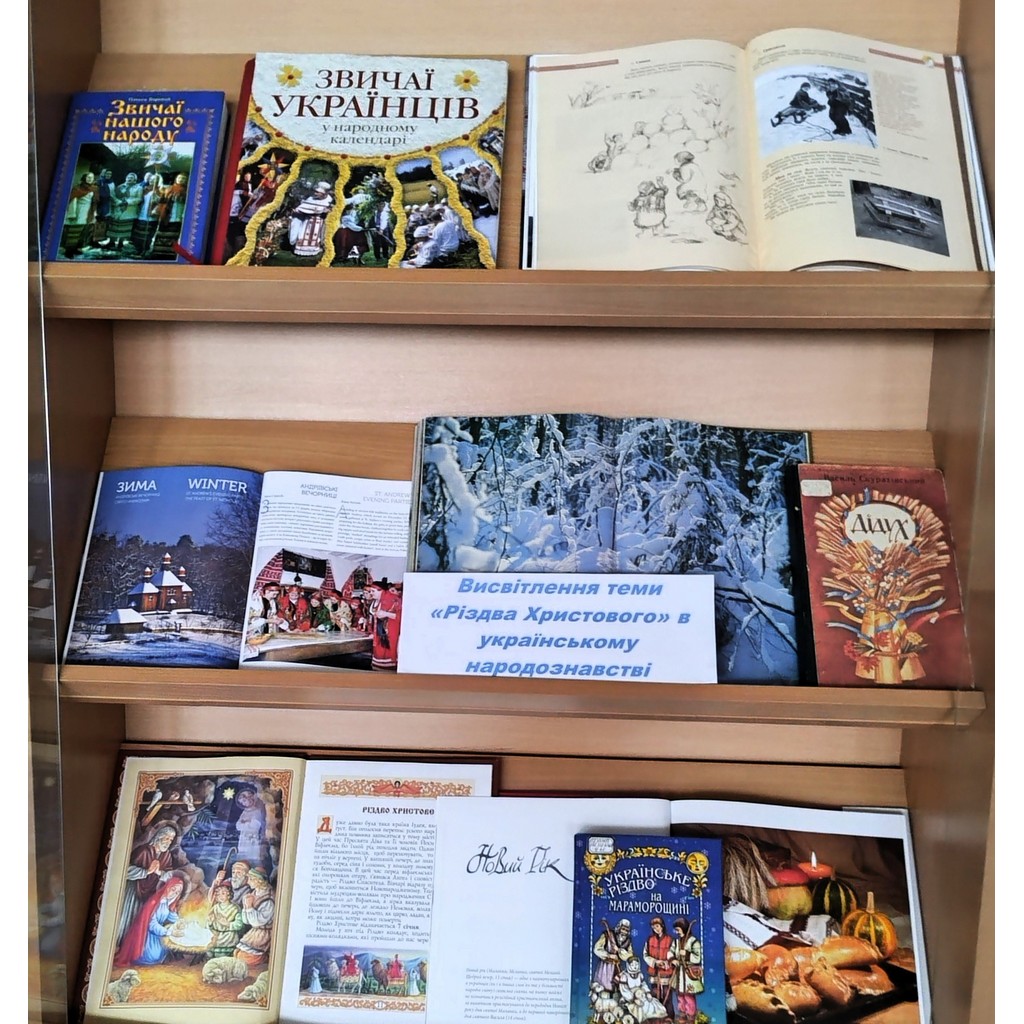 На виставці книг представлені видання, що яскраво розкривають змістовну сутність різдвяно-новорічної обрядовості, наповнення традицій української обрядовості сакральністю. Також представлена література, що знайомить з традиціями, обрядами і святами українців, що передують Різдву (Катерини, Наума, Андрія, Миколая), а також обрядовими дійствами на Різдво («Коза», «Маланка», колядування тощо).