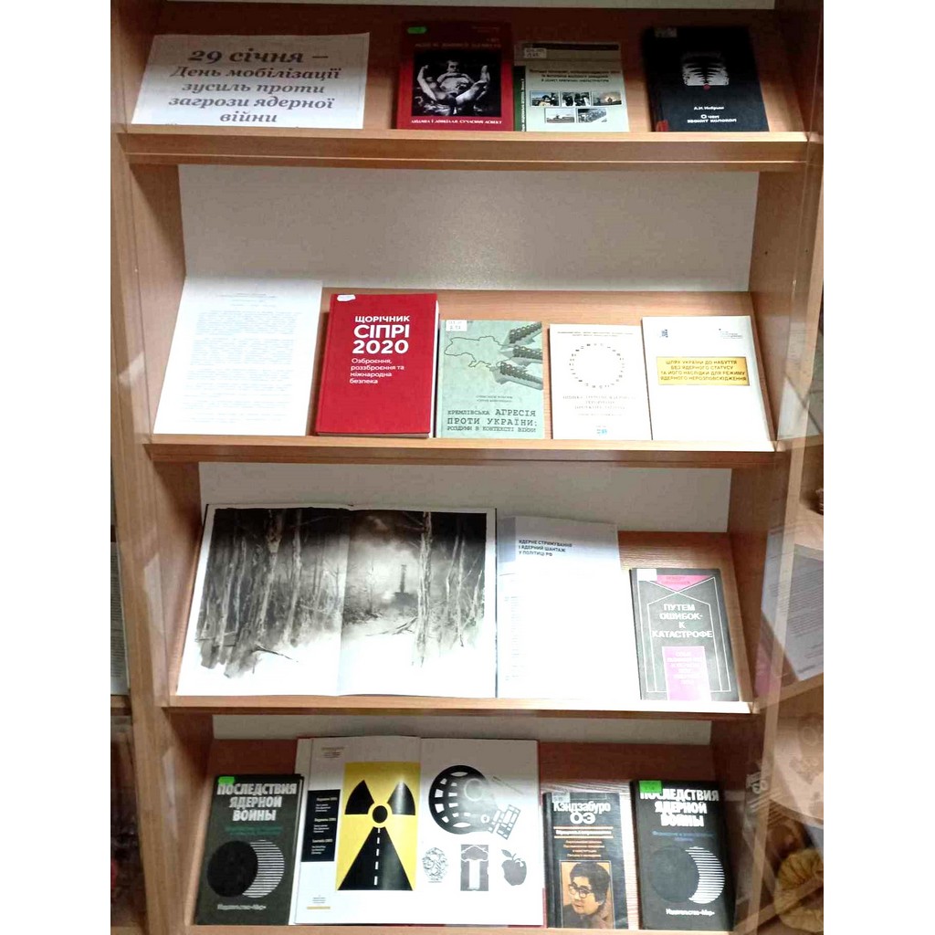 На книжковій виставці експонуються документи про співробітництво держав у сфері забезпечення ядерної безпеки та література, яка висвітлює всі страшні наслідки застосування ядерної зброї.