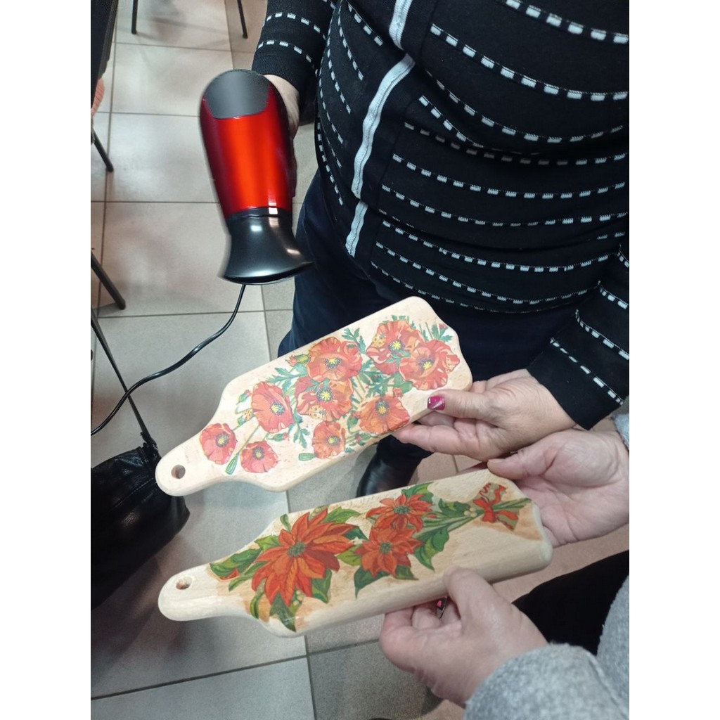 На зайнятті учаснки ознайомилися з основними техніками декупажу. Під керівництвом майстрів кожен створив власну декоративну дощечку, використовуючи серветки з традиційними українськими візерунками, квітами, орнаментами та символами. Під час творчої роботи відбулося невимушене спілкування про українську культуру та традиції. Учасники згадували обряди, свята, символіку українських вишиванок, значення кольорів і орнаментів.
