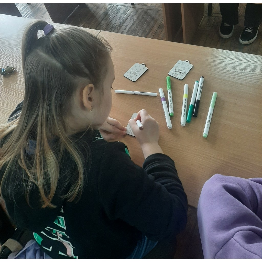 3) майстер-клас з розпису брелоків «Ангел – охоронець» з керівником гуртка Альоною Мінчук (4-7 класи). Мета: навчити учасників техніці розпису акриловими фарбами на дерев'яних або акрилових заготівках у формі ангела, створення унікального брелока з символічним значенням;