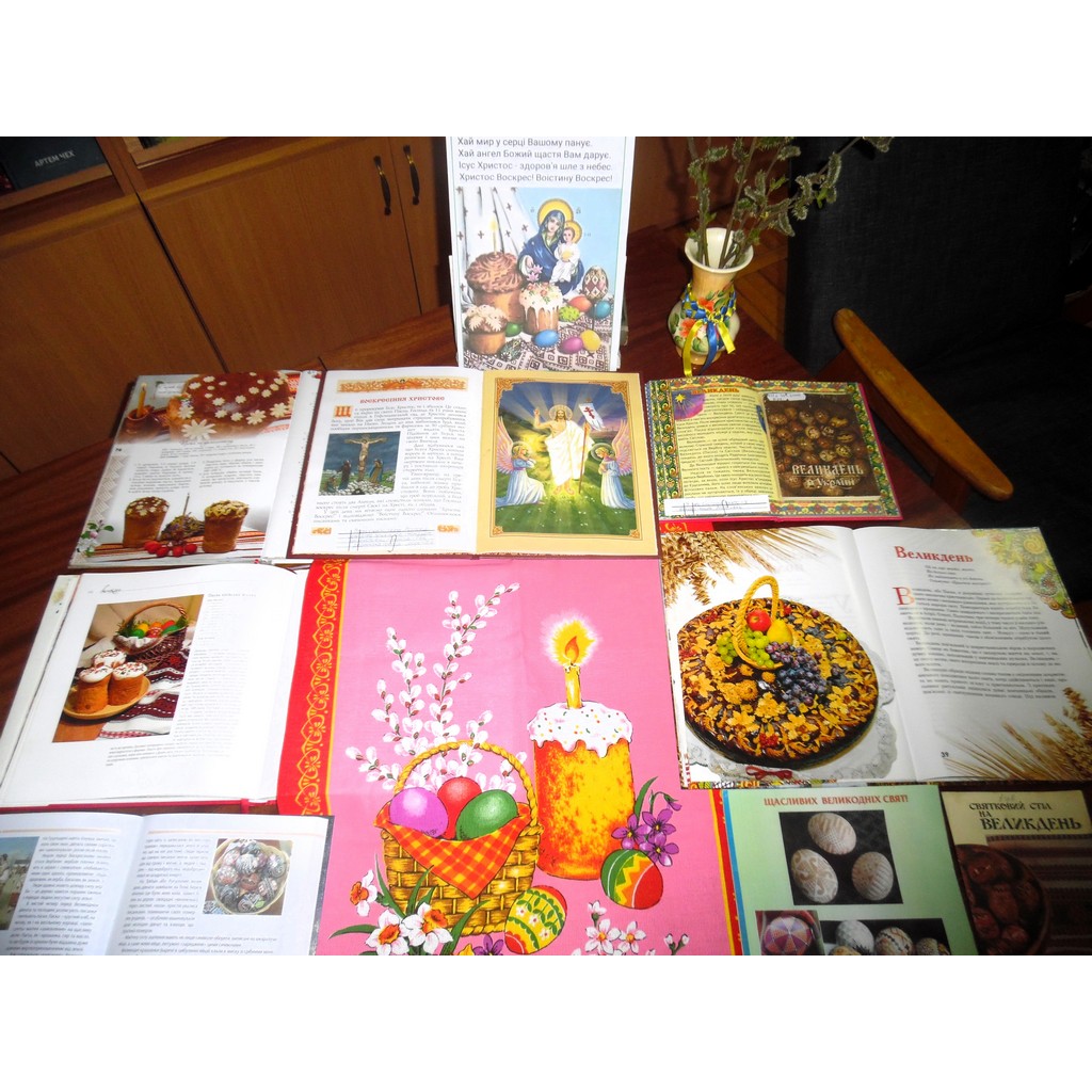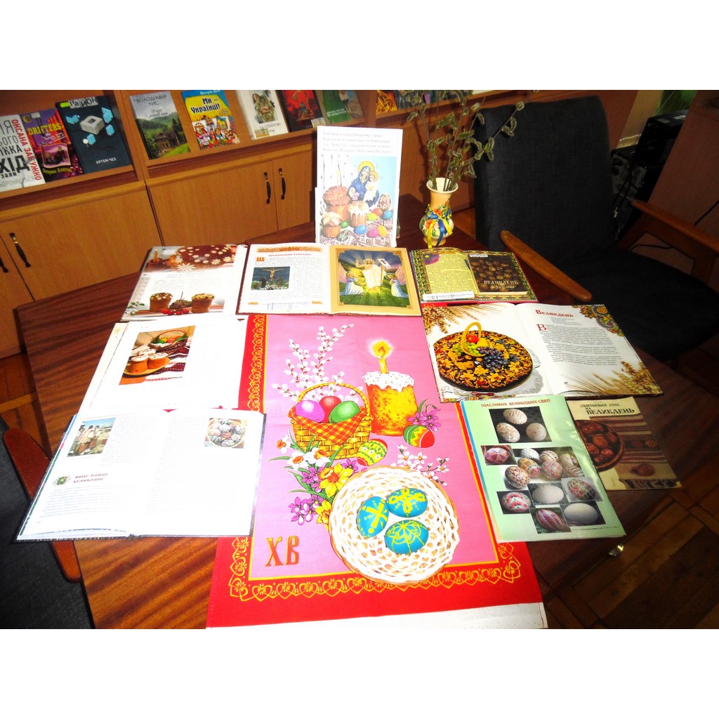 З нагоди світлого дня Воскресіння Господнього відділ україніки пропонує переглянути книжкову виставку-інсталяцію «Великодні передзвони». На виставці представлені книги з яскравими ілюстраціями про великодні свята; рушник із зображенням верби, паски і крашанок, а також писанки, розмальовані дітьми.