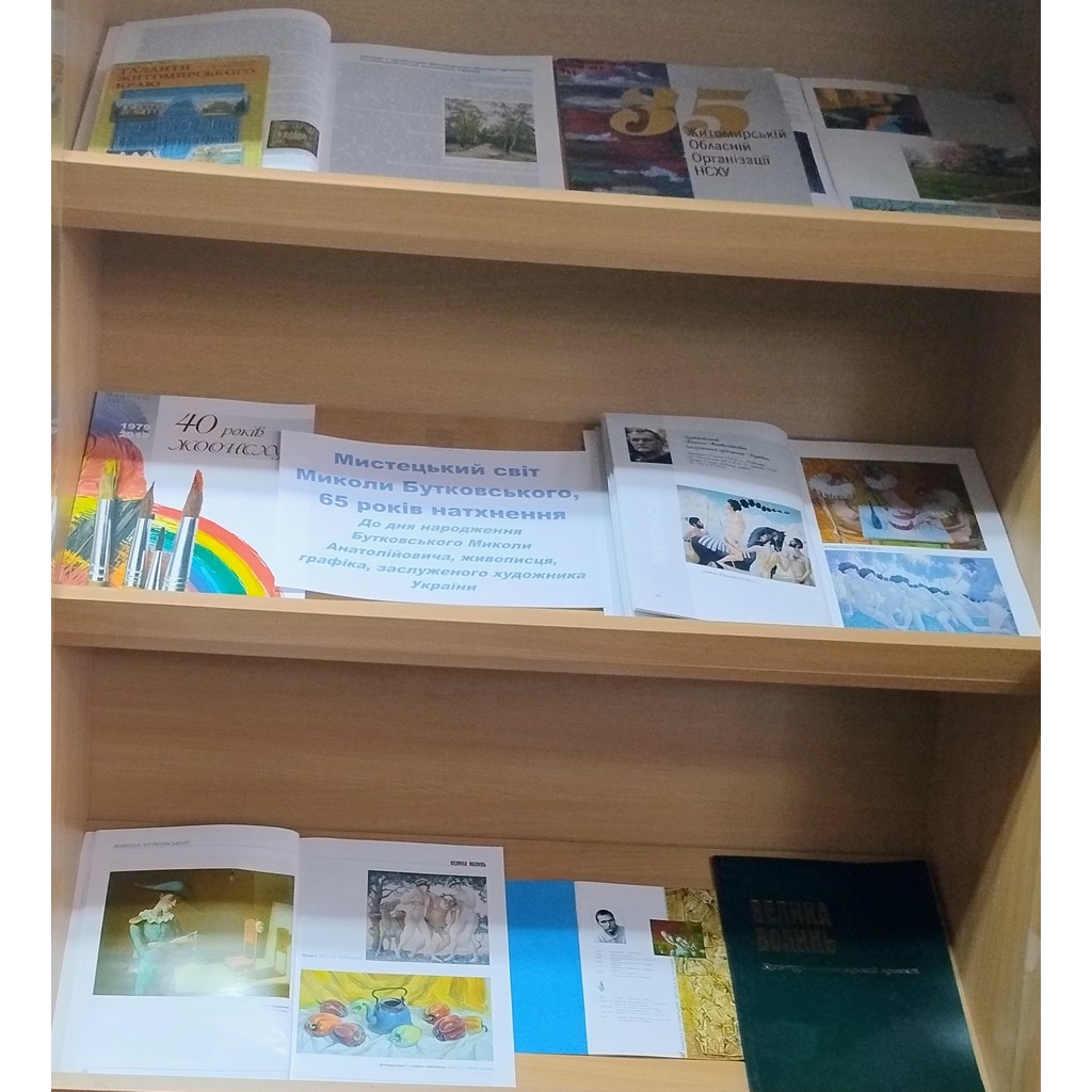 Книжкова виставка «Мистецький світ Миколи Бутковського, 65 років натхнення» присвячена творчості житомирського художника, педагога, громадського діяча – Миколи Бутковського. Його ім’я відоме поціновувачам живопису, адже майстер зумів відобразити у своїх роботах душу рідного краю, архітектуру, людей. На виставці представлені: альбоми репродукцій робіт митця, які демонструють розмаїття жанрів у творчості митця – від пейзажів до портретів; каталоги виставок, у яких він брав участь, зокрема персональні виставки в Житомирі та інших містах України. Особливе місце займають матеріали про викладацьку діяльність художника, адже він виховав не одне покоління талановитих митців.