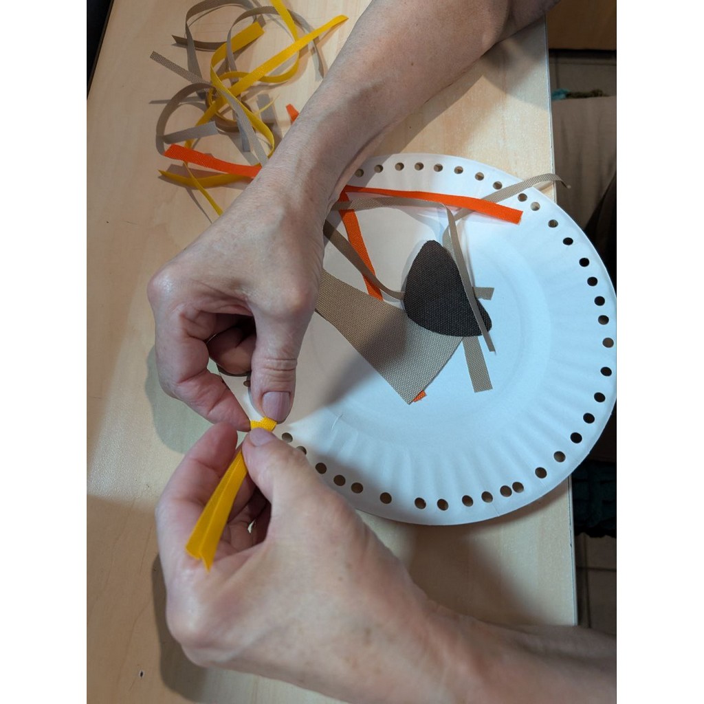 На цьому занятті учасники створювали декоративний місяць із кольорових клаптиків тканини та картону. Основу майбутнього елементу інтер'єру оздоблювали зірками, виготовленими з блискучого фоамірану.