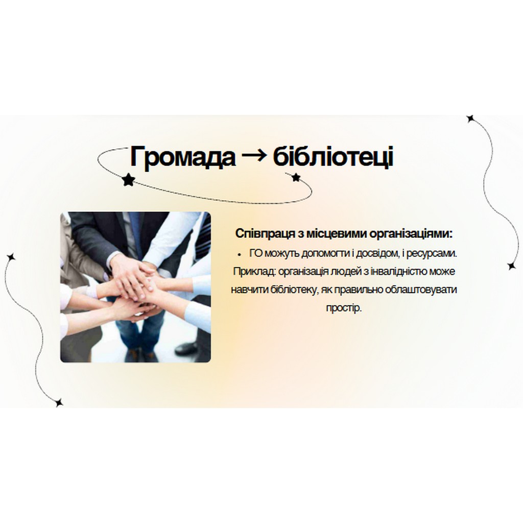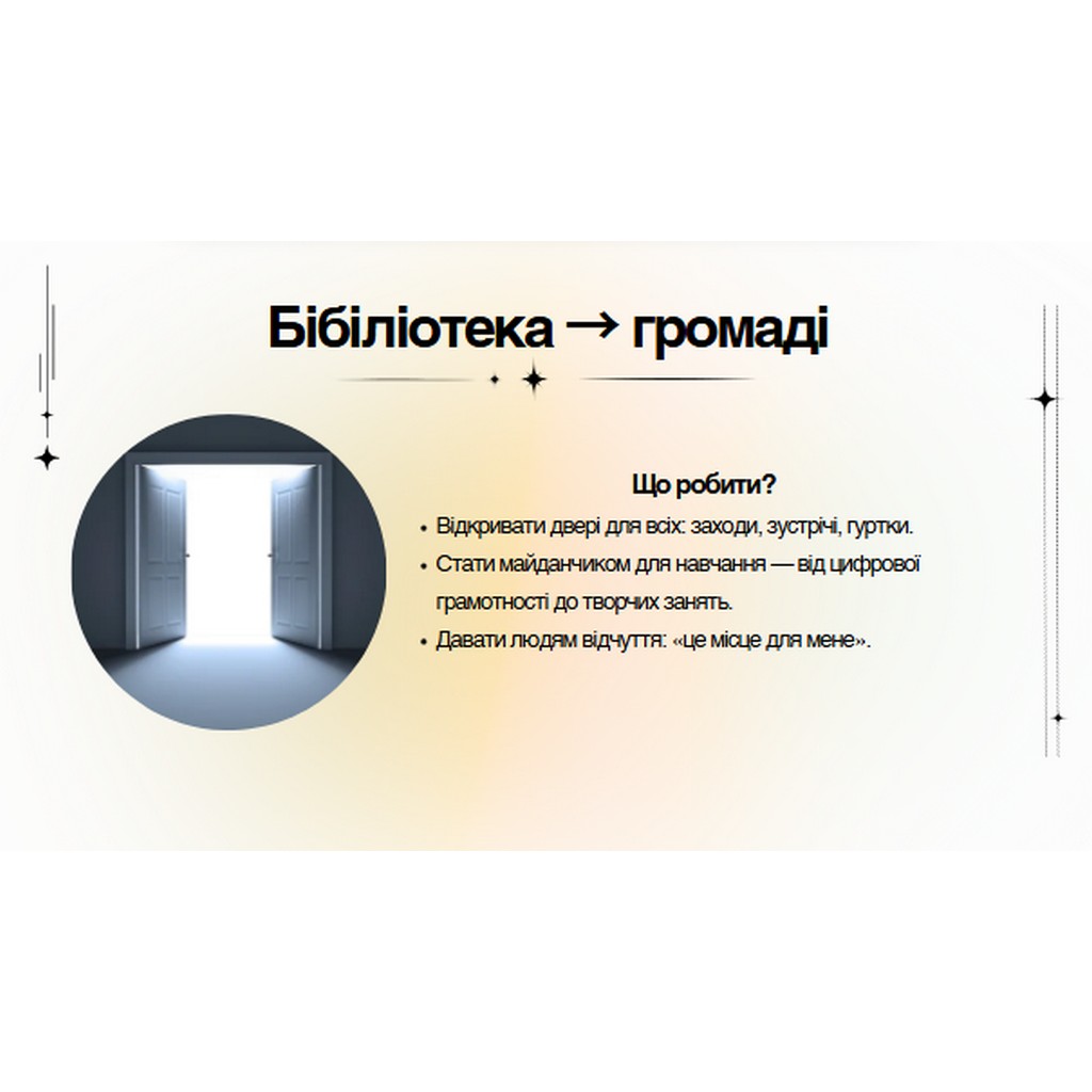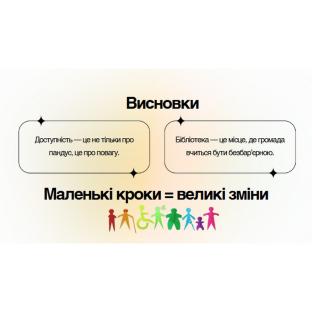 Під час зустрічі учасники обговорили, як саме місцеві ініціативи, гранти та партнерство з волонтерами й громадськими організаціями допомагають бібліотекам ставати більш інклюзивними. Було представлено досвід різних бібліотек, які перетворюються на простори рівних можливостей, створюють «тихі зони», розвивають культурні та освітні програми. Міжнародні та національні програми фінансування відкривають значні можливості, але ключовим залишається активне залучення громад.
