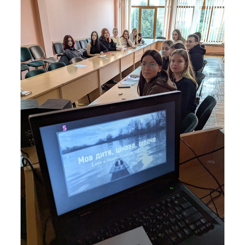 Зустріч розпочалася з інтерактивної онлайн-розминки на платформі Wayground, яка допомогла учасникам налаштуватися на гру, перевірити уважність та швидкість мислення. Основна частина гри складалася з чотирьох раундів, в яких студенти пригадували літературних героїв та авторів, назви відомих книг та імена українських поетів за піснями, які створені з їхніх віршів.
