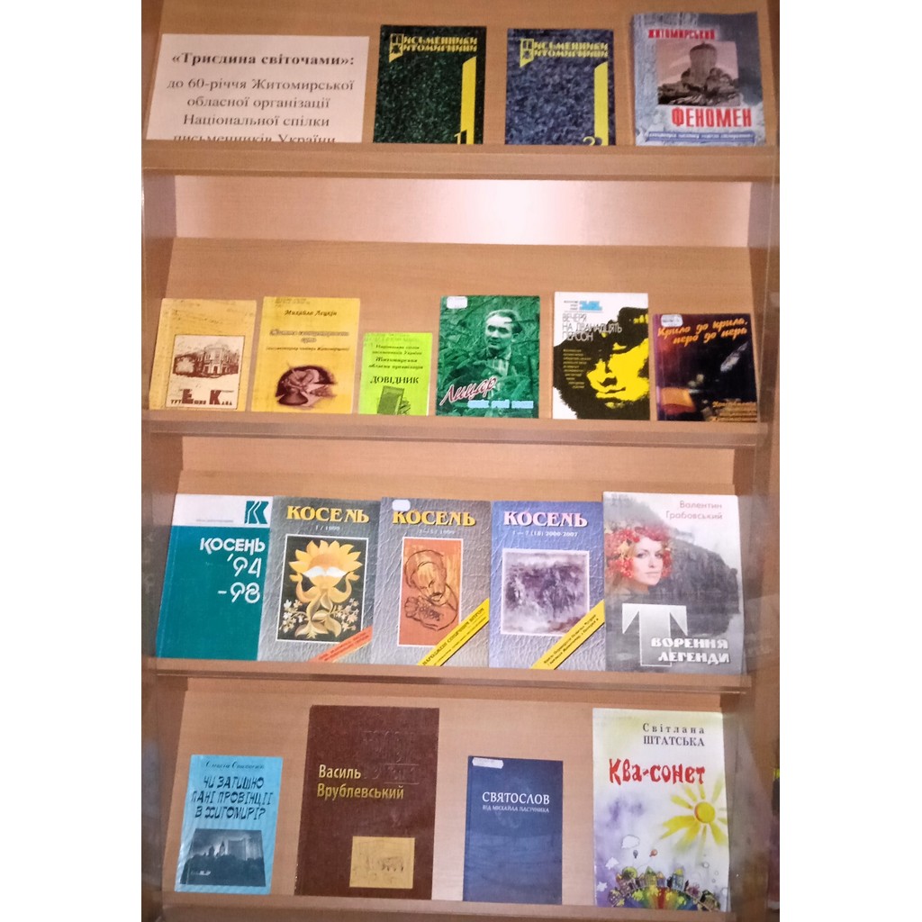 До 60-річчя Житомирської обласної організації Національної спілки письменників України 1 жовтня 2025 року в холі ЖОУНБ ім. О. Ольжича відділом краєзнавства представлена виставка «Триєдина світочами».