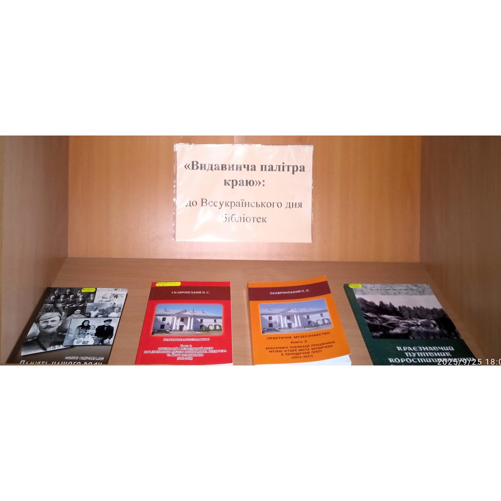 • До Всеукраїнського дня бібліотек 30 вересня 2025 року у відділі краєзнавства ЖОУНБ ім. О. Ольжича представлена виставка «Видавнича палітра краю».