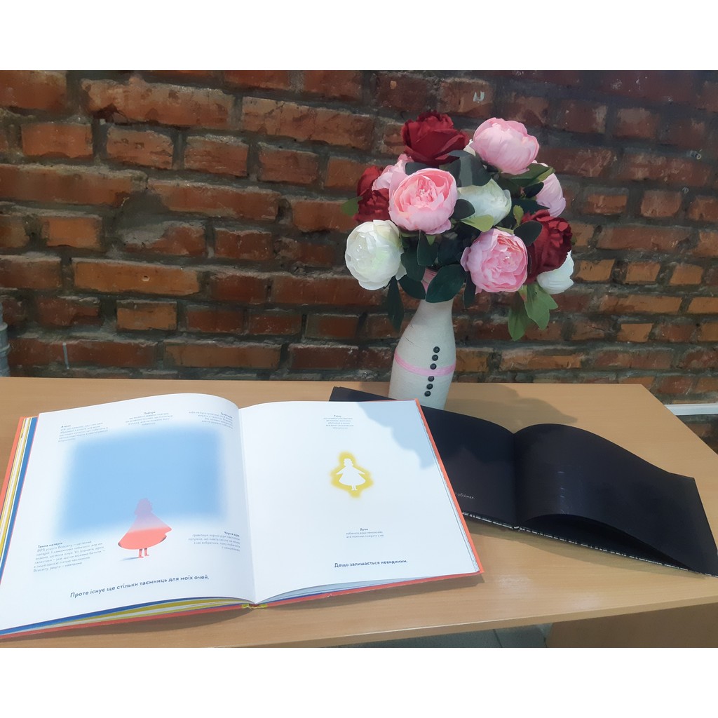 «Чорна книга кольорів» авторка Менена Коттін, ілюстраторка Розана Фаріа. Це унікальне видання, яке перевертає уявлення про звичайну книгу. Тут ви не побачите яскравих фарб очима, але відчуєте їх на дотик. Книга створена для того, щоб зрячі люди могли зрозуміти світ незрячих, а діти з порушеннями зору – “побачити” кольори через асоціації, запахи та смаки.