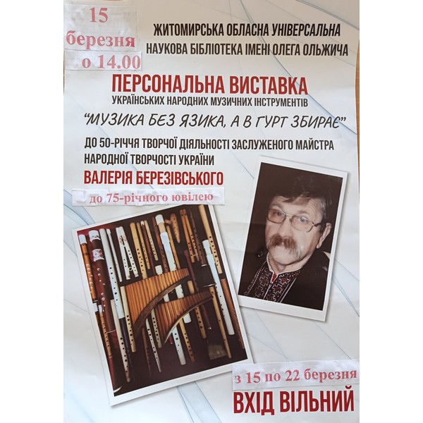 15 березня 2026 року о 14.00 у відділі мистецтв та соціокультурної діяльності бібліотеки відбудеться відкриття персональної виставки «Музика без язика, а гурт збирає…» до 75-річчя від дня народження майстра народної творчості, житомирського музиканта, майстра з виготовлення музичних духових інструментів Валерія Березівського.